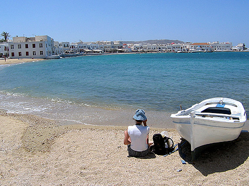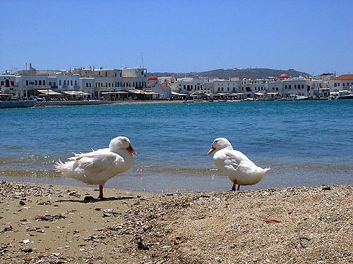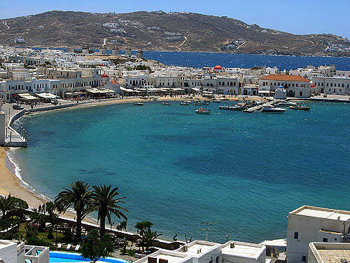 Mykonos Chora is a stunningly pretty town, with the brightly painted balconies of the whitewashed cube shaped houses and a maze of narrow streets, is gathered around its harbour in the middle of a wide bay. Traffic is banned from Mykonos town center, thus the character of the town has been preserved.